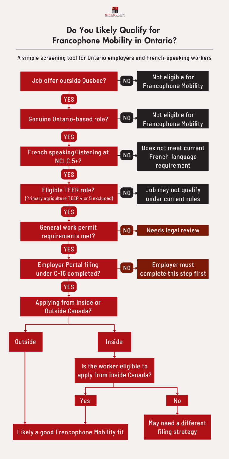 Legal disclaimer: This article is general information for Ontario readers and employers. It is not legal advice. Francophone Mobility files are fact-specific, and outcomes often depend on current status in Canada, the real work location, the genuineness of the job offer, the worker’s French-language evidence, and whether the employer completed the portal steps correctly.